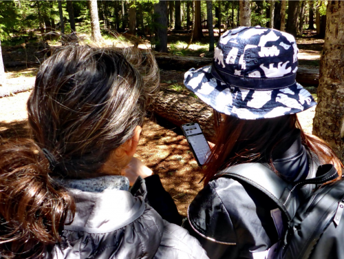 Mt. Hood National ForestのTwin Lake CampgroundにてFulcrumというフィールド調査用アプリを使って各サイトの野営インパクトの状況を評価中(写真:Marion J. ,2019/6/3)